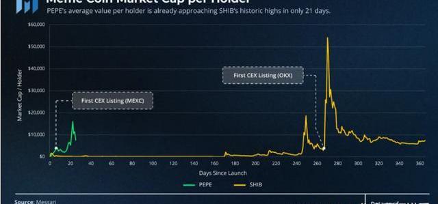 可以说,推动Pepe增长的最重要因素是加密货币参与者现在熟悉了Meme币从2021年以DOGE和SHIB为首的初始周期中如何快速增长。抢先一步有利可图,这种自我强化的力量随着Meme的流行度增加而吸引更多的买家。如果我们观察PEPE和SHIB的每个持有者的平均价值,以每个持有人的持有市值衡量,我们会发现PEPE显示出与SHIB相似的增长模式,但速度要快得多。