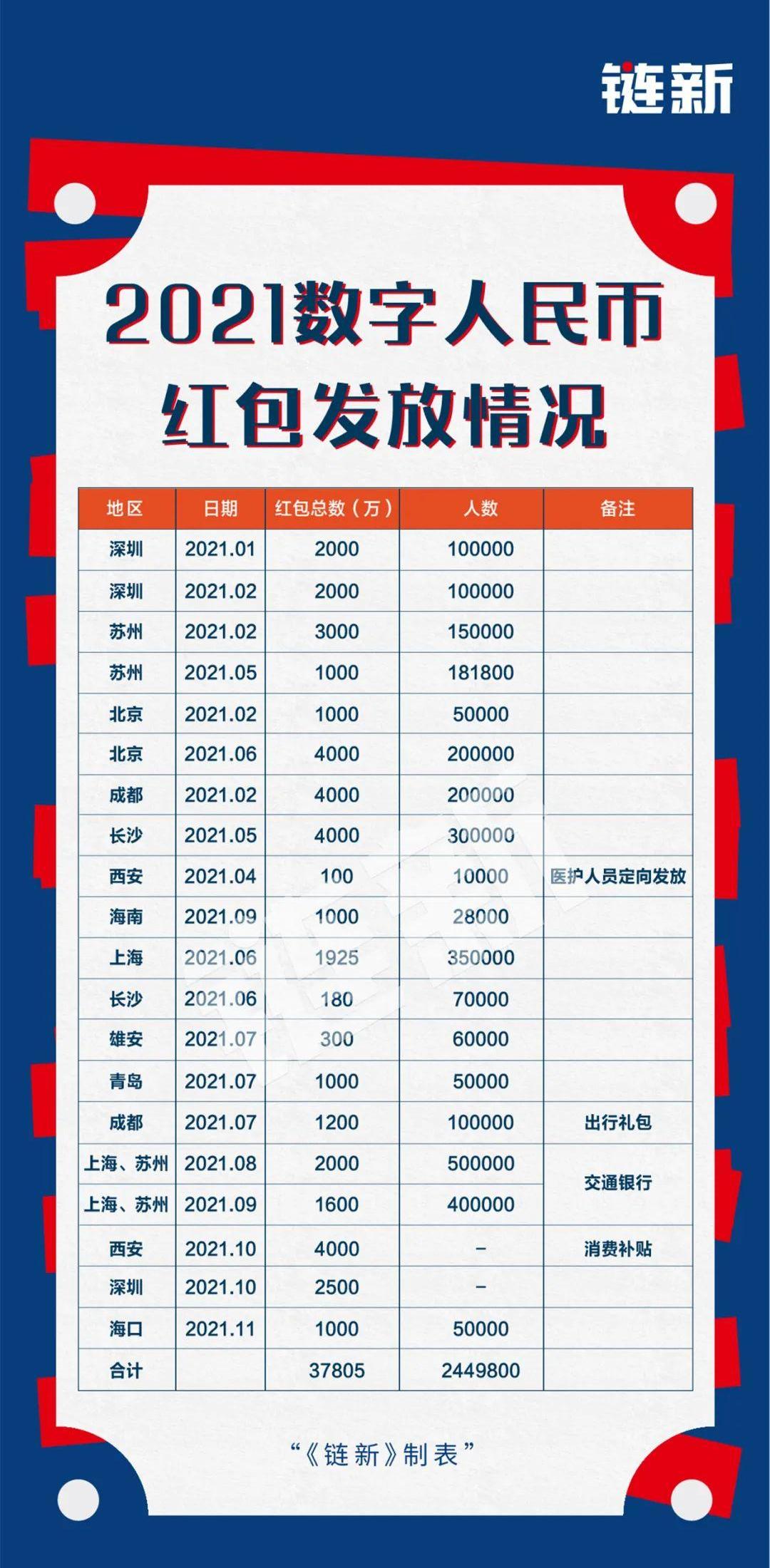 据《链新》统计,截至2021年11月末,2021年各地共计发放数字人民币红包3.78亿元,共244.9万人抢到。