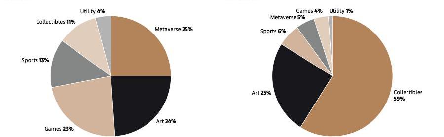 从数据图可以看出,收藏品类与艺术品类几乎各占领NFT市场半壁江山,而游戏、体育、元宇宙类等NFT品类也在慢慢崛起。目前NFT市场虽交易额及单价相对较小,但艺术家、艺术品和收藏家人数活跃比例却极大超过传统艺术市场。