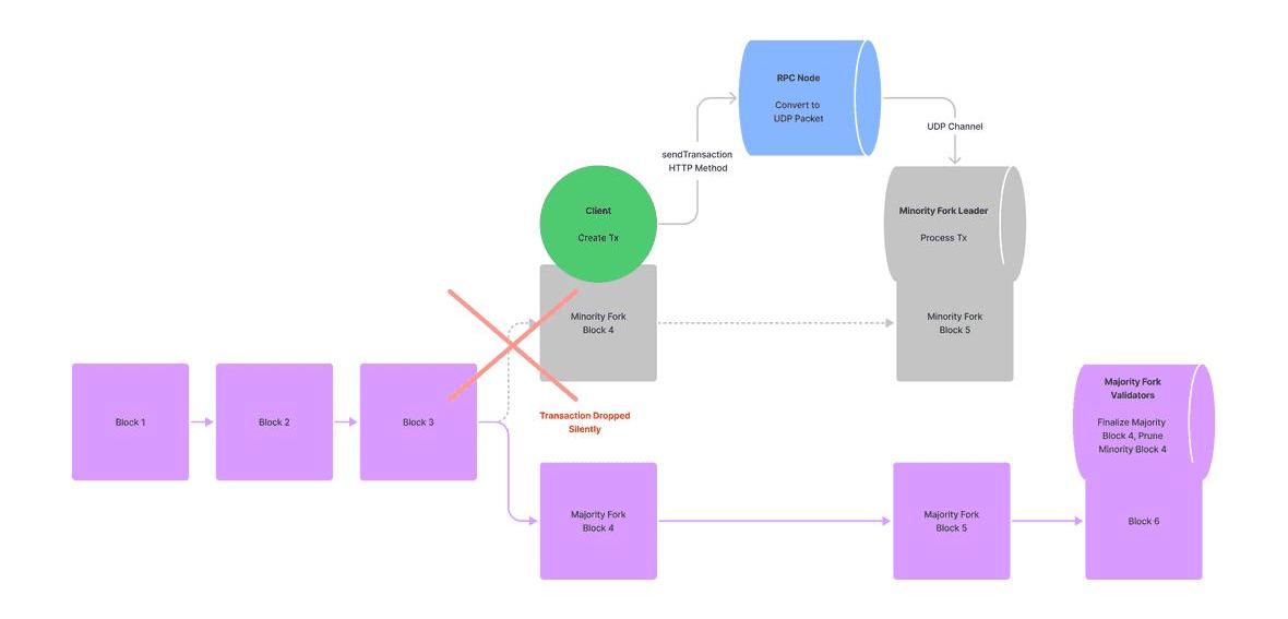 如果一个交易引用了少数分叉的最近区块哈希,该交易仍有可能被处理。然而,在这种情况下,它将由少数分叉的领导者处理。当这个领导者试图与网络的其他成员分享其处理的交易时,它将无法与大多数不承认少数分叉的验证器达成共识。这时,交易将在最终完成之前被丢弃。