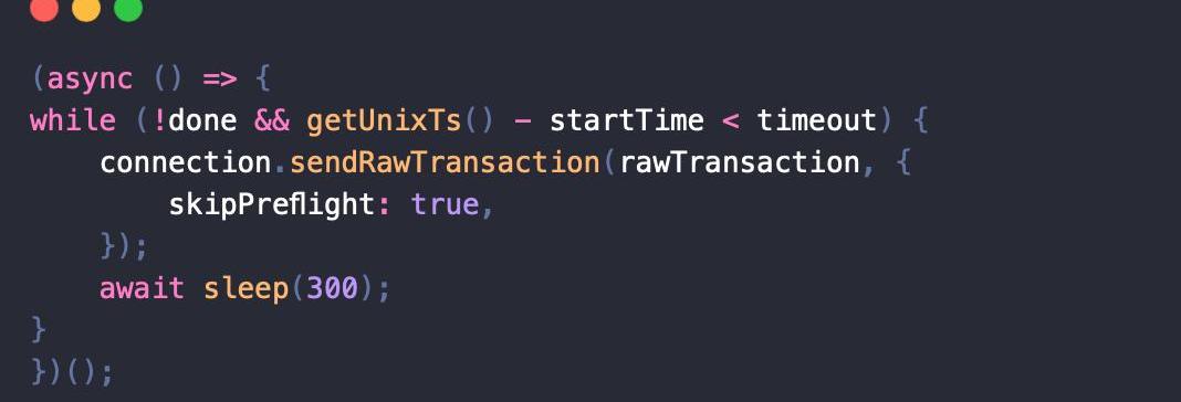 手动重试交易的一个常见模式是来自getLatestBlockhash临时存储的lastValidBlockHeight。应用程序一旦存储起来,就可以轮询交易集群的区块高度,并在适当的时间间隔内手动重试交易。在网络拥堵的时候,将maxRetries设置为0并通过自定义算法手动重播是很有利的。虽然一些应用程序可能采用指数退避算法,但其他应用程序,如Mango,选择以恒定的时间间隔连续重新提交交易,直到发生某种超时。