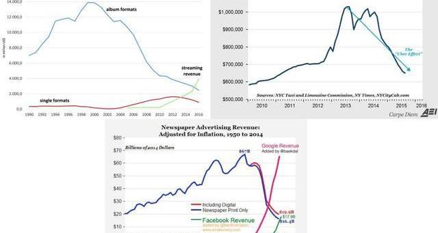 科技并没有通过传统的激进主义颠覆音乐产业、出租车行业或报纸行业。它只是生产更好的产品,让数百万人自愿选择购买或使用。通过这些安静的、个人的决定产生了巨大的变化,如下图所示: