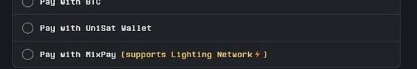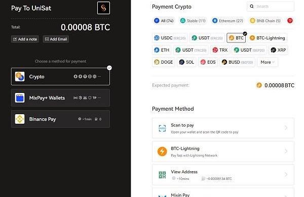 提供了三种支付方式,1、直接用BTC支付;2、用UniSat钱包支付;3、用MixPay支付。1、2打开可以直接支付,3界面如下: