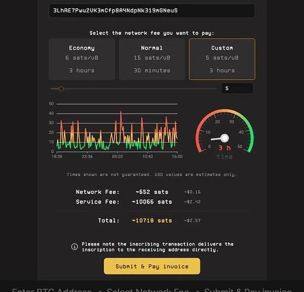 步骤3:输入你的比特币地址以接收BRC-20并选择网络费用