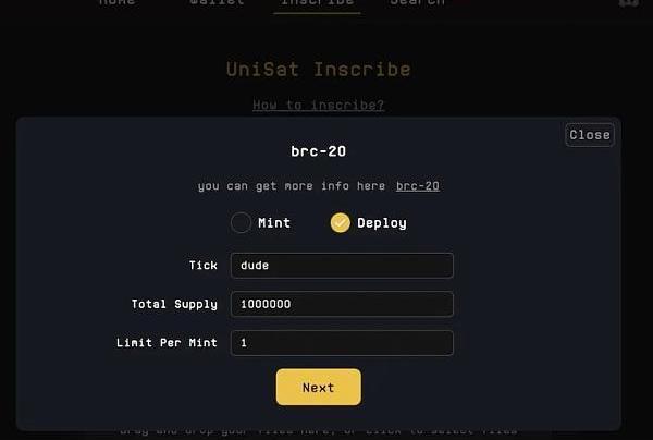 步骤2:在“Inscribe”选项卡中设置BRC-20代币详情