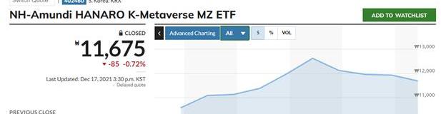 NHAmundi资产管理推出的NH-AmundiHANAROK-MetaverseMZETF于2021年10月15日开始正式交易。截至2021年12月17日,该基金收盘于11675韩元,上市至今涨幅10.51%。