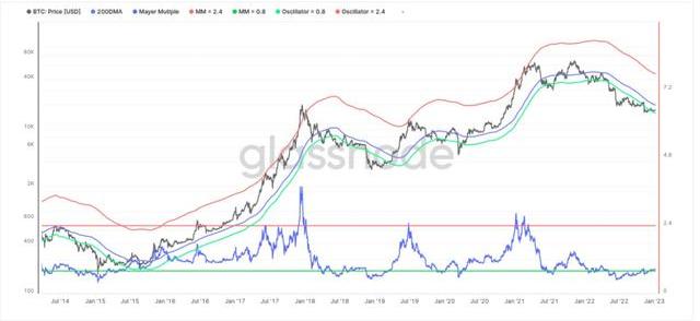 BitcoinMayerMultiple表明我们回到了0.8multiple以上。这突破了历史上只有在熊市最恐慌阶段才会达到的水平,约有15%的交易日低于该水平。
