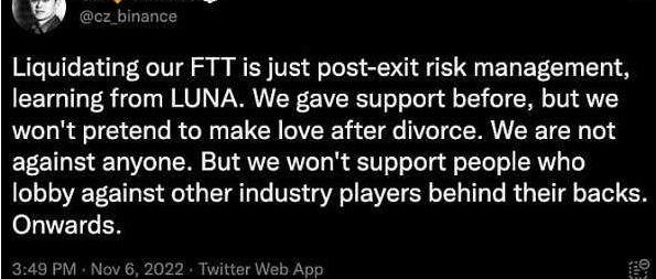 这时候,CZ和币安进场了。当FTX或是一颗新星时,事实上,币安就卵化了这一交易所;她们是我国最早的投资人之一。但负债表泄漏后,币安公布宣布选择撤出其所持有的21亿美金FTT。