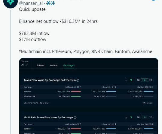 然而,根据Nansen的说法,在过去的24小时内,币安的净流出量为3.163亿美元,流入7.838亿美元,其中11亿美元通过主要网络撤出。