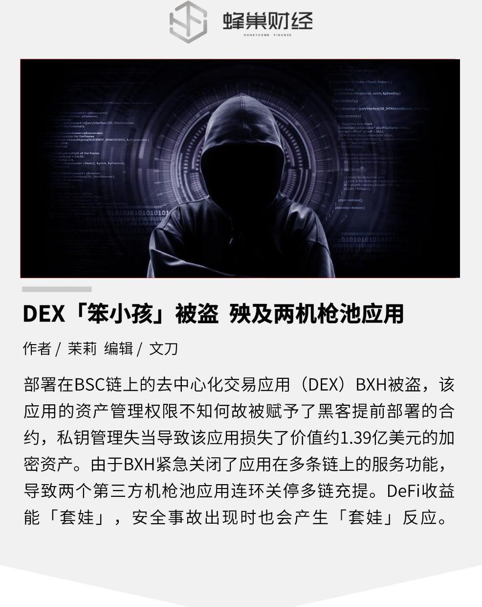 10月30日,多链部署的去中心化交易应用BXH被盗,损失了价值约1.39亿美元的加密资产,此次安全事故发生在BSC链上的BXH协议,据该应用官方声明显示,以太坊、OEC链、Heco链上的BXH协议及资产未受影响,但出于安全考量,关闭了所有链上的对外服务。
