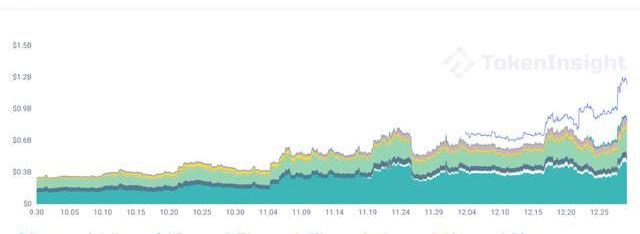 值得注意的是,目前各大交易所的未平仓量波动相对平稳,但Huobi的未平仓量于近期呈现稳定上升趋势,其BTC/USDT交易对未平仓量从4870万美元左右,最高上升至1.6亿美元左右;而ETH/USDT未平仓量从2500万美元左右上升至12月28日的4760万美元左右,且上涨势头仍在稳定持续中。