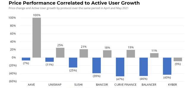 在21年第一季度,Uniswap和PancakeSwap获得了最大的市场份额。它们的价格走势直接反映了用户采用情况,Uniswap的季度回报率为444%,而PancakeSwap在21年第1季度以3031%的巨大回报率超过了该行业的其他产品。