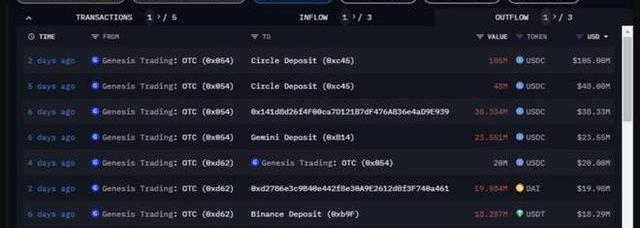 另一方面,从ArkhamIntelligence提供的数据,我们还可以发现在过去7天,Genesis已透过OTC方式处理了将近3亿美元的稳定币赎回,其中包括价值2.5亿美元的USDC、1,830万枚USDT和价值2000万美元的DAI。