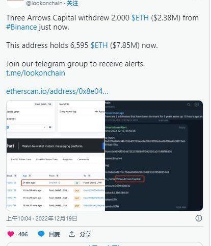 今天早些时候,链上加密货币分析公司Loononchain还报道称,已倒闭的加密货币对冲基金三箭资本(3AC)也从币安转移了价值240万美元的2000ETH。他们仍然继续在交易所持有价值约800万美元的ETH。
