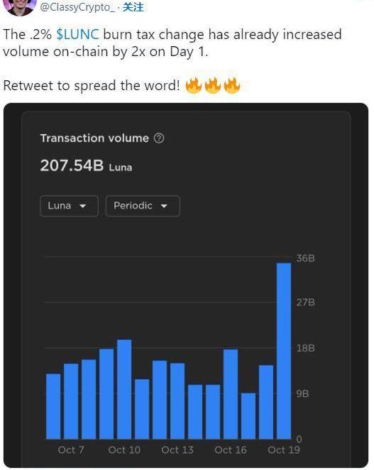@ClassyCrypto_在描述增长图表时写道,“0.2%的LUNC烧钱税变化已经在第一天将链上交易量增加了2倍。转发推文以传播信息!”