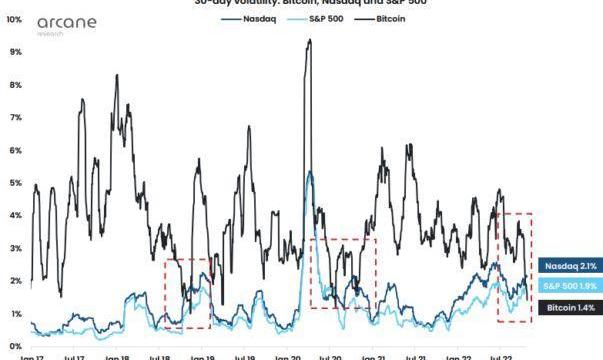 如上图所示,过去几个月比特币30天波动率急剧下降,而标准普尔500指数和纳斯达克指数稳步攀升。