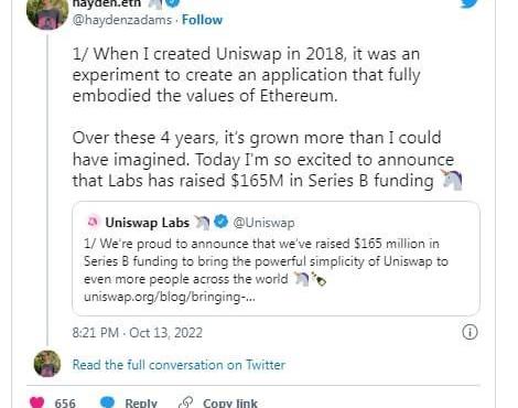 10月13日,UniswapLabs宣布获得由PolychainCapital领投的1.65亿美元B轮融资。该交易还得到了领先的加密投资者的支持,如AndreessenHorowitz、Paradigm、SVAngel和Variant。