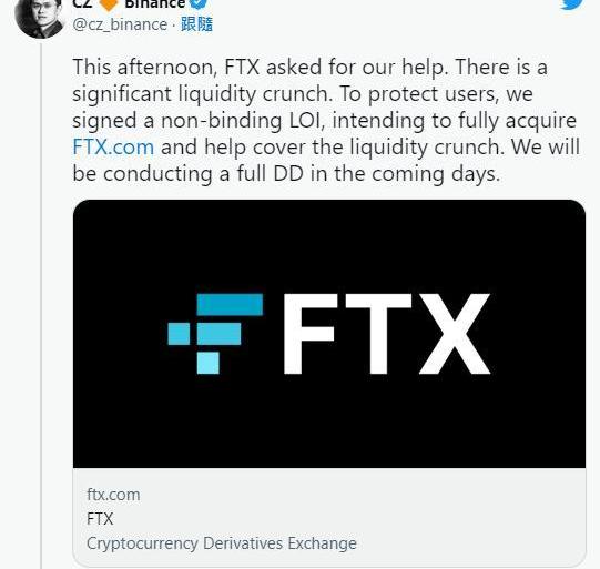 赵长鹏在推特上证实,这两家加密货币交易所巨头签署了一份不具约束力的意向书。然而,这条发文的讯息含量远超市场预期,当中提及到FTX已出现明显的流动性危机,再者,由于意向书不具约束力,币安可以随时退出交易。