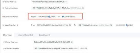 前两个地址共转入了3.5亿美元的USDC,用以偿还在借贷协议JustLend上的借款。