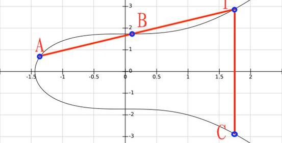 通过几何意义可以清楚的理解这种运算的定义,例如我们选取了曲线上的两个点A和B计算加法,把A+B的结果记为C,过程如下:
