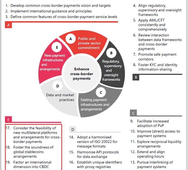 其中,探索新的支付技术、制度和安排只有三个方向,包括考虑新的多边跨境支付平台及部署、观察全球稳定币的发展、以及CBDC的探索。