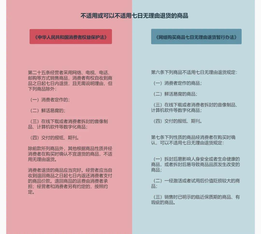 《中华人民共和国消费者权益保护法》第二十五条及《网络购买商品七日无理由退货暂行办法》规定,对于网络方式售出的商品,消费者有权自收到商品之日起七日内退货,且无需说明理由,同时也对不适用或可以不适用七日无理由退回的商品进行了如下规定: