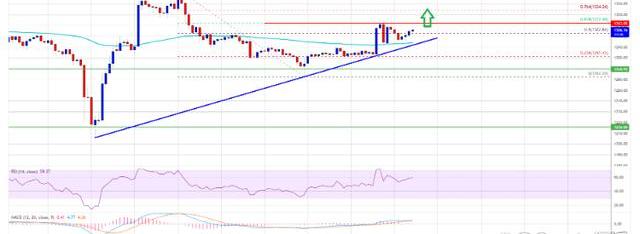 在ETH/USD的小时图上形成了一条关键的看涨趋势线,支撑位在1,295美元附近。