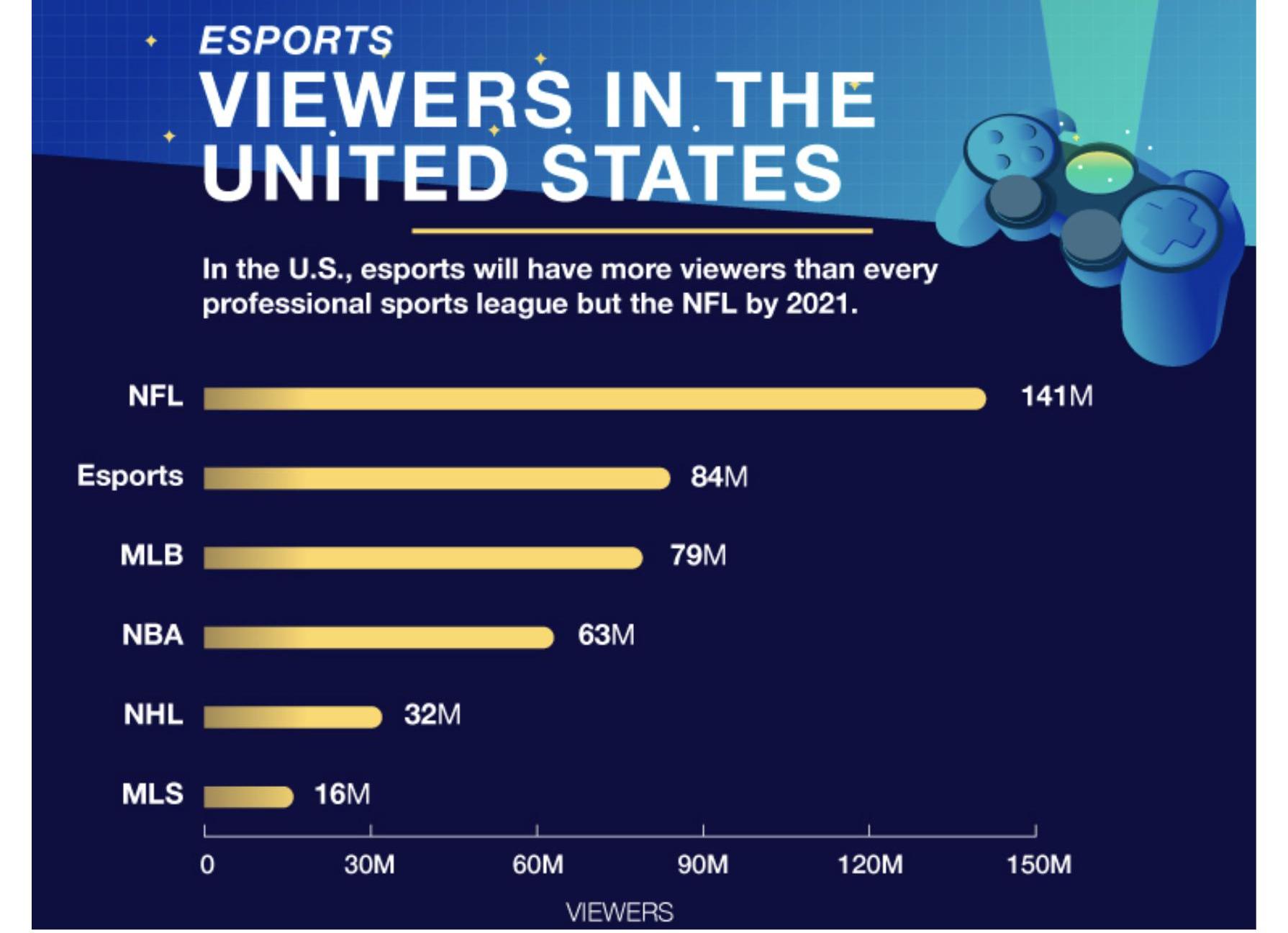 2018年观看人数最多的四项美国体育赛事中,有三项甚至都不是传统体育赛事。它们是电子竞技赛事。例如,《英雄联盟》锦标赛的浏览量比亚足联锦标赛多3000万次,比NCAA橄榄球锦标赛多4500万次。