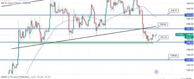 以太坊目前的交易价格略高于关键的1,500美元双底支撑位,收盘价高于该水平可能会引发潜在的上涨趋势至1,560美元
