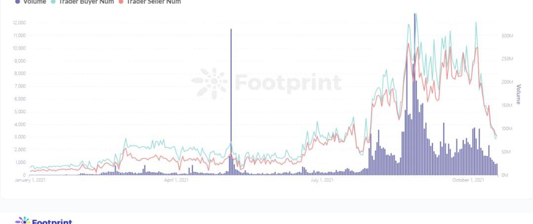 2021年的NFT市场经历了爆发式的增持,市值从1月份中旬的5500万美金涨至10月份的51亿美元,涨幅9282%,NFT持有者人数也从最开始的19万人暴涨至目前的56万,上涨195%。NFT每日的交易量也于2021年8月上升明显,交易人数不断攀升,到10月逐步恢复理性。