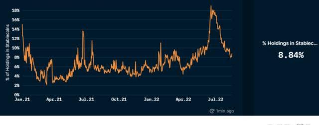 市场缺乏增量资金支持,或对中期发展不利。本轮反弹以来,散户通过场外增持USDT入场,而部分机构大户通过USDC合规渠道套现离开。USDT发行量过去1月增加14.4亿美元;而USDC过去1月减少14.9亿美元,二者变动基本持平。而场内存量稳定币统治率从6月最高点19%下降到现在9%,接近历史均值附近,可以看出这波反弹主要是存量资金博弈。