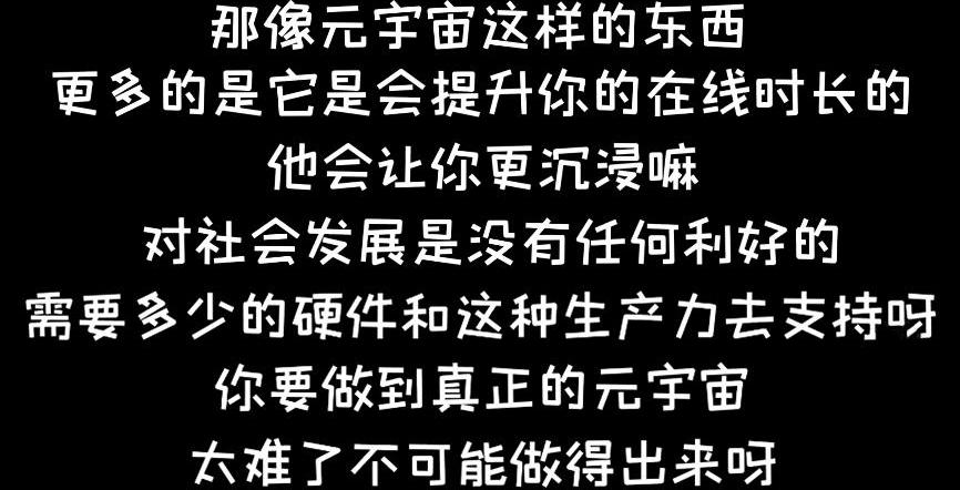 主播对此表示自己并不看好元宇宙,认为这一方面会让人沉浸于虚拟世界,长远下来不利好社会发展。另一方面技术等各种现实问题很长一段时间难以实现我们理想中的元宇宙世界。