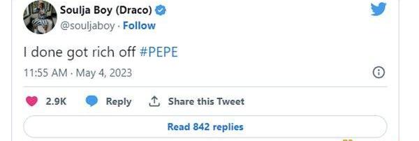 Pepe币的炒作是不可否认的。DeAndreCortezWay就很欢欣雀跃地在宣传Pepe币。“PEPE币真的让我发家致富了,”他周三在Twitter上写道。