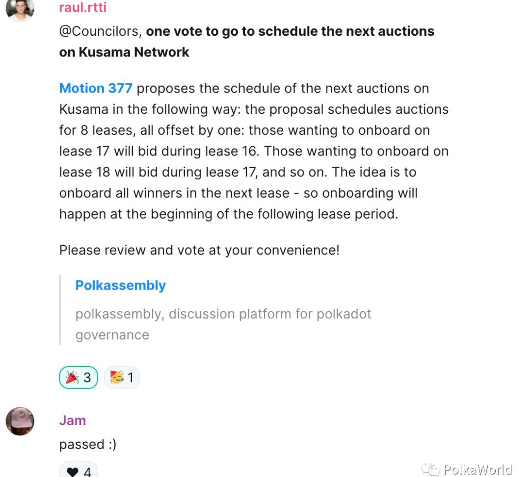 10月19日,Kusama理事会通过了Motion377。该议案是由社区成员Jam提出,旨在开启Kusama网络的连续Auction。https://kusama.polkassembly.io/motion/377