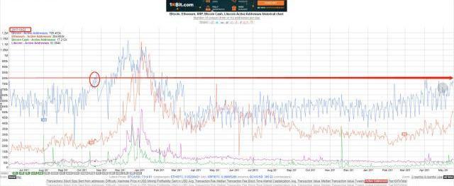 由图可知,和目前同等活跃用户数量的日期是在,2017年10月22日附近,此时的比特币价格是在6200美元附近,而目前的比特币价格是7300美元附近,我们可以这样理解,目前7300美元价格处于高估状态,或者6200美元的比特币处于支撑状态。