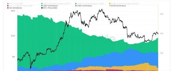 自2020年初以来,除了2022年夏天的一个短暂时期外,ETH在四大稳定股中占据绝对优势,当时稳定股战胜了ETH。然而,在2022年11月短暂经历了类似的stablecoin胜利后,ETH加强了其在stablecoin中的地位,并自那以来保持了弹性。