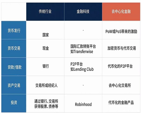 简单说,就是试图利用区块链技术实现去中介化,消除寻租中间人,从而从各方面改善当前的金融体系,解决传统/中心化金融存在的天然短板。比如解决金融体制不平等、审查流程繁琐、缺乏透明性和潜在的交易风险(不履行合同义务的风险即坏账)等等。