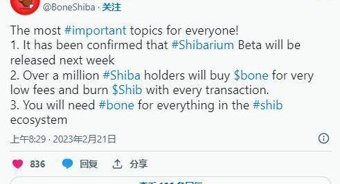 在BONE周一表示ShibariumBeta将在下周发布之后,出现了激增。“超过一百万的Shiba持有者将以非常低的费用购买bone,并在每笔交易中销毁Shib,”BoneShibaswap发推文说。