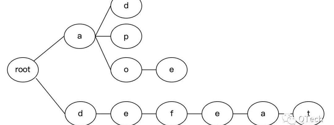 MPT主要结合了默克尔树和前缀树的特点,前缀树顾名思义,是一种利用字符串的公共前缀来进行查询的树,如下图所示,用来查询有共同前缀的数据不需要进行字符的比对,十分方便,但缺点也十分明显,如果一个字符串与其他节点没有公共前缀时,便会带来很多节点的创建,造成存储空间的浪费。