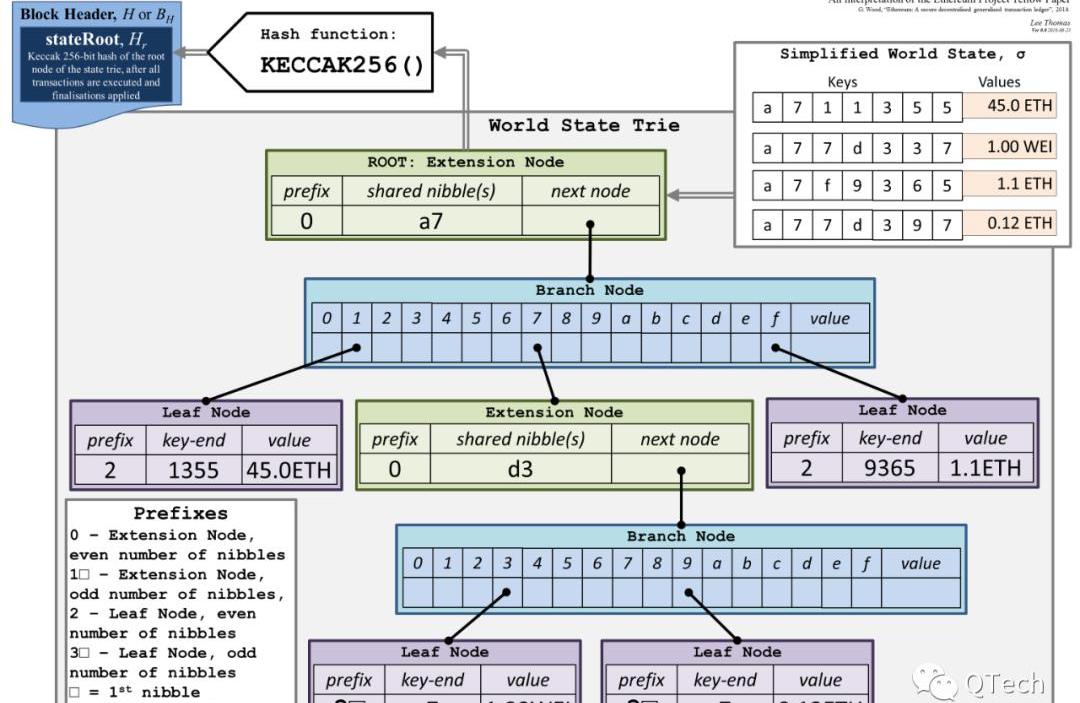对MPT上的数据进行增删改查,需要通过前缀索引到对应的节点,叶子节点的改动会带来新的分支节点或者扩展节点的加入,新的节点需要进行哈希计算得出新的哈希值,然后更新父节点的信息,造成索引路径上节点的哈希值的连锁的改动,最后生成一个唯一的“世界状态”。