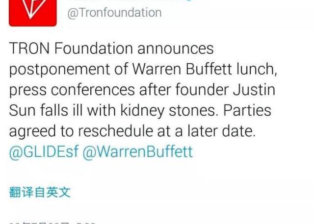 “本人因突发肾结石正于医院治疗,因故取消与巴菲特先生的午餐会面。”