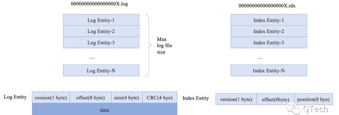 数据以文件的方式记录到磁盘中,log为后缀的文件记录原数据的信息,idx为后缀的文件记录以log文件为单位的文件索引信息,用于快速定位需要查找的数据位置,每一个log文件都配套有一个相同前缀的idx文件。文件名前缀均为文件中存储的第一条数据的偏移量数值。每一个log文件都有大小限制,当文件超过该限制时,新打开一个文件用于后续数据写入。