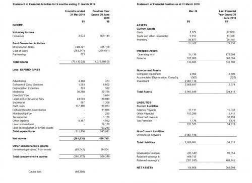 从该财务报表的内容显示,比照去年的收入情况,截至今年3月的连续9个月内,基金会捐款从之前的82.9万美元减少到了3674美元,此部分收入缩水近99%,并且,商业销售部分从之前的近19万美元利润,到今年则反而亏损了7.5万美元。所以在去年实现了100多万美元的收入后,今年来逃避基金会总的业务收入为-7万美元。
