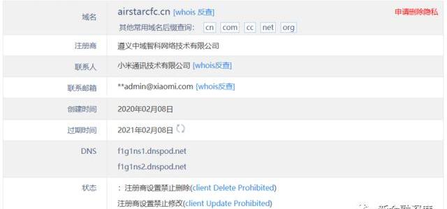 站长之家查询信息显示,今年2月8日,airstarcfc.cn这一域名被注册,注册商为遵义中域智科网络技术有限公司,联系人为小米通讯技术有限公司。据了解,遵义中域智科为我国144家域名注册服务机构之一,由通信管理局审批,法定办理周期为20-30个工作日。同在2月8日,airstarcfc.com这一域名被注册,不过当天即过期,2月20日有过一次更新。