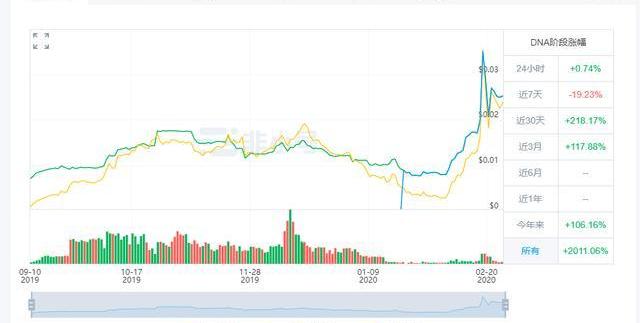 DNA总发行量为1000亿,目前流通量为100亿,现价$0.025,市值17.75亿元,全球排名第29位。目前DNA已上线九家交易所,包括富比特、ZB、BIKI等。DNA上线的时机很不错,正赶上市场从大熊市中逐渐复苏的时间段,外部资金不断涌入。相比于套牢盘众多的老项目,增量资金和新用户更倾向于技术实力强劲且没有套牢盘的新项目,而DNA恰好是一个完美契合的优质标的。因此,DNA上线后走势强劲,多次出现单日40%以上的暴涨,不仅吸引了眼球也为日后的上涨打下了坚实的基础。