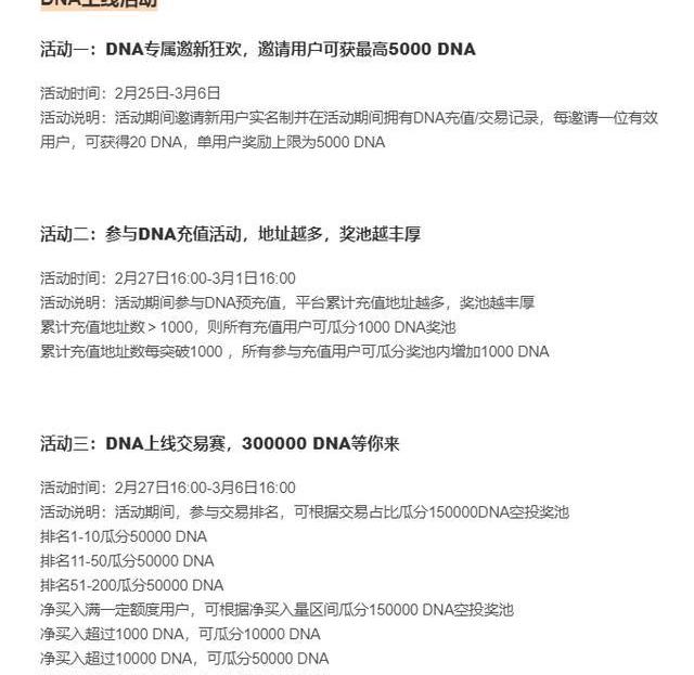 DNA上线仅仅不到半年便已冲到全球市值前30位,项目实力可见一斑。同时,DNA将于2月28日上线币赢CoinW等老牌交易所,同时币赢交易所也准备出了史诗级的活动福利,这无异于为DNA的持续上涨注入了一针强心剂!