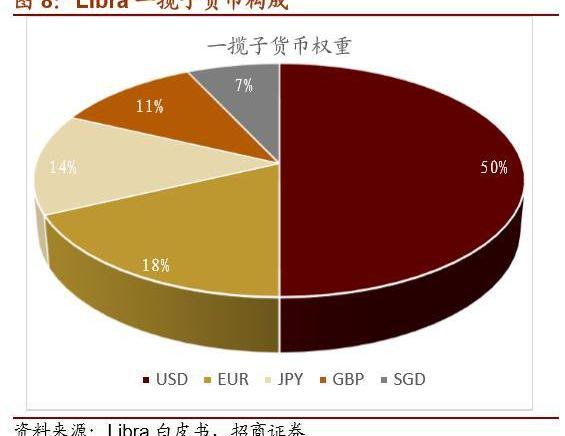 以真实资产储备作为担保,定位成为稳定币:根据Facebook披露Libra一揽子货币中美元占比50%,欧元占比18%,日元占比14%,英镑占比11%,新加坡元占比7%。其中用新加坡元代替了人民不,对人民币极其不利。使用者可以用五种货币中的任意一种兑换Libra,Libra协会负责平衡一揽子货币。