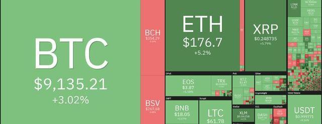 BTC在过去一天的大部分时间里都在8000美元区间的高位盘整,也为一举突破9万美元奠定了基础。据coin360的数据,两小时前,这一数字资产飙升至9180美元的高点。截止发稿前,其价格有所回落,目前暂报9135美元,24小时涨幅3%。