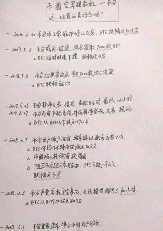 最后,请你看一个图,这个图是我今天在群里看到的,是从18年2月份开始到昨天,币安的消息,跟比特币价格的相关信息的图片,一共9次,你看完有什么感想呢?写在评论区,我们明天见