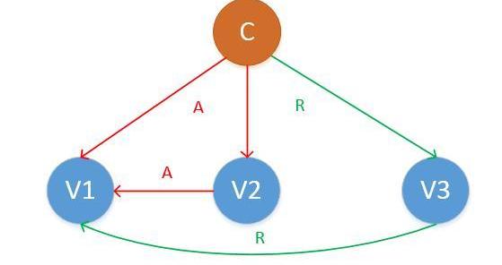 当C和V1,V2是忠诚的,V3是叛徒时。C向V1,V2,V3发出进攻命令,V2告诉V1自己收到进攻命令,V3告诉V1自己收到撤退命令,此时V1收到的信息集合为{A,A,R},取多数原则,执行进攻命令。其余忠诚副官同理执行进攻命令,实现准确性和全局一致性。